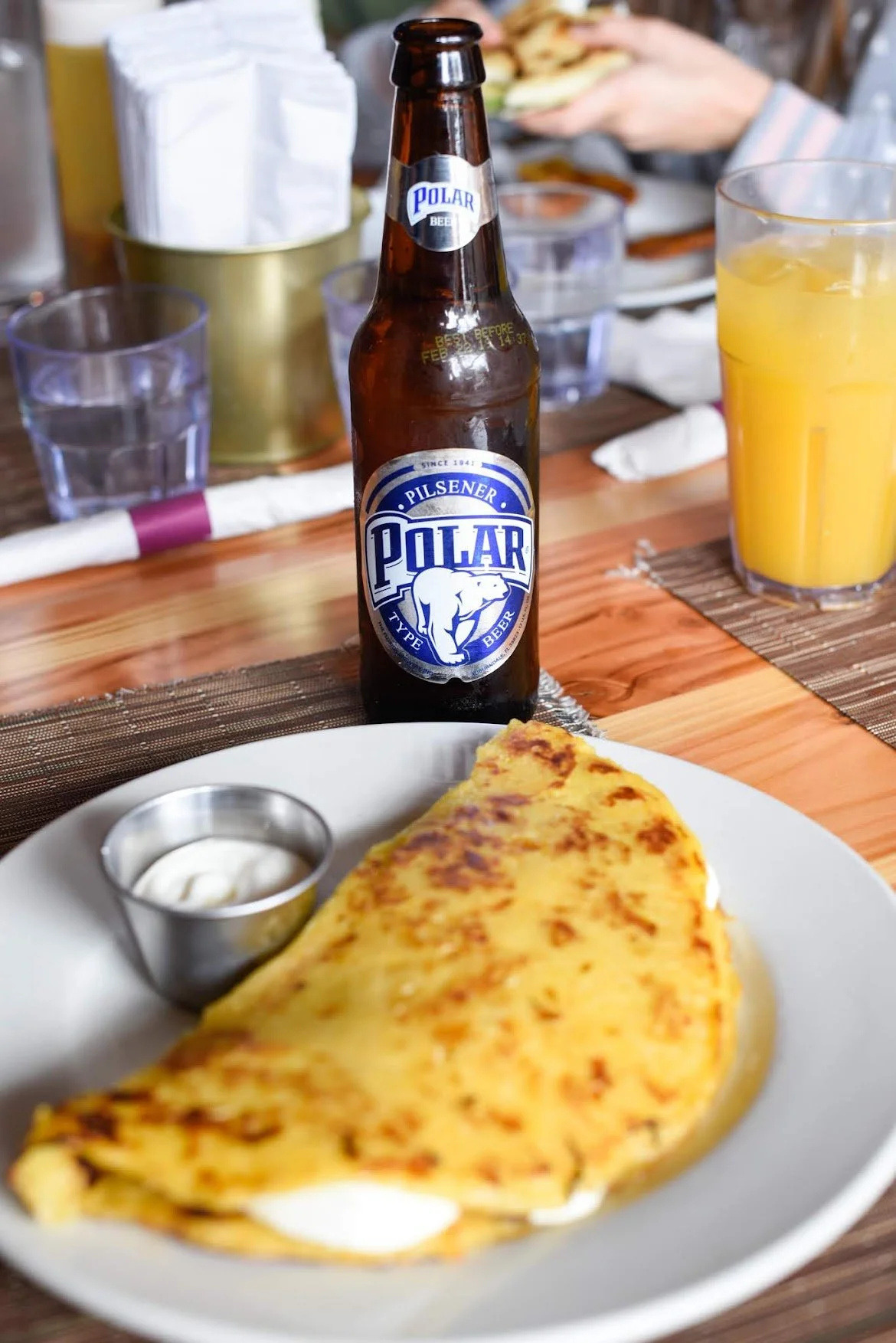 Shrimp cooked in fresh tomatoes, onions and cilantro with white rice, black beans sprinkled grated white cheese and fried sweet plantains.